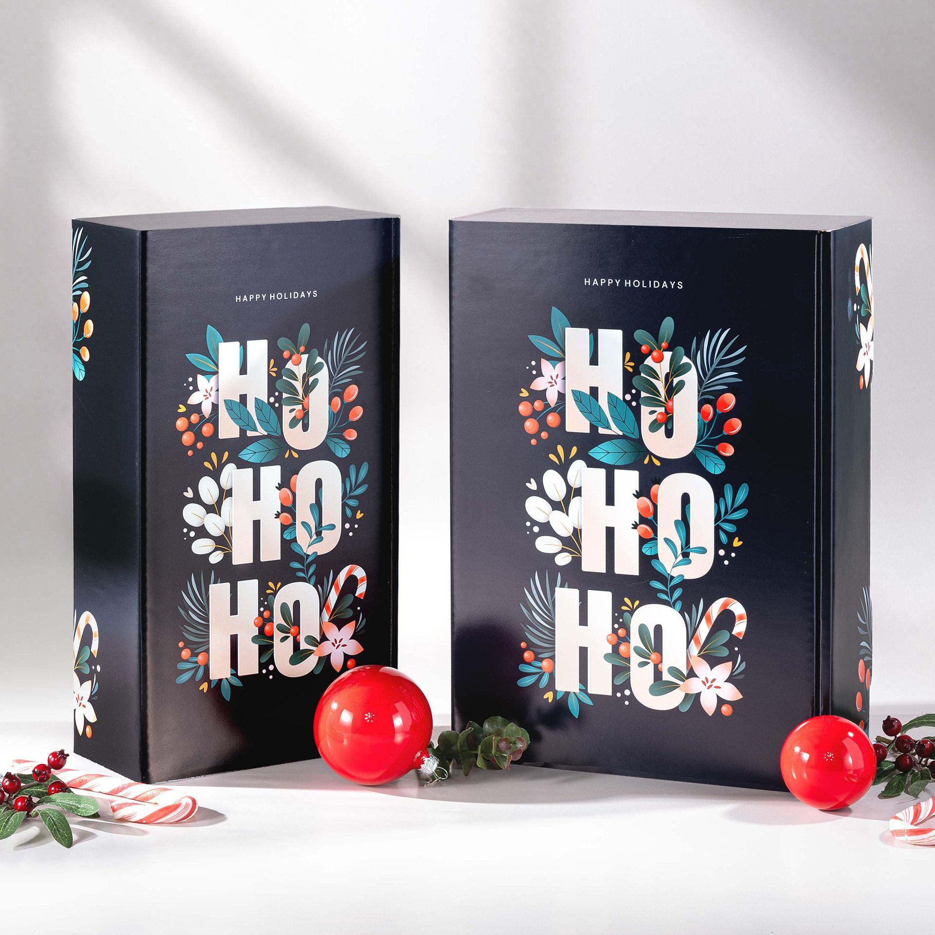 Opakowanie na prezenty HoHoHo to pudełko z nadrukiem napisu HoHoHo na czarnym tle tektury. To bardzo dobra propozycja dla zestawów prezentowych mających utrzymać nowoczesny i ekologiczny format prezentu.